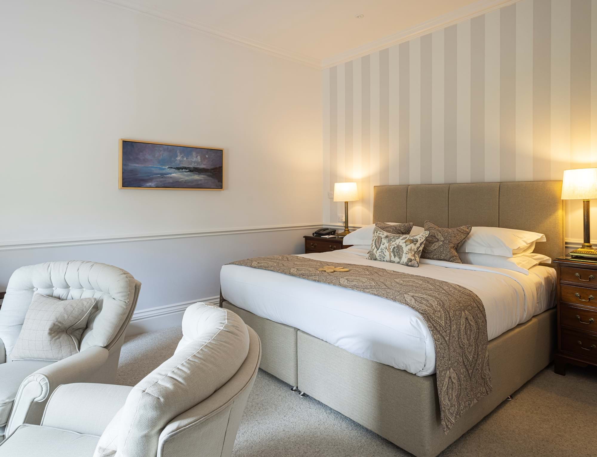 Luxuriate in one of our impeccable rooms or premier Stable Suites, offering the very finest home from home comforts. Soft, simple muted tones with sumptuous bedding and crisp linen, spacious bathrooms with separate walk in showers and baths* along with Molton Brown products, all create an overall feeling of comfort, charm and understated elegance. All rooms include complimentary bathrobes, hairdryers and tea and coffee making facilities, with open views across our gardens and the countryside beyond.